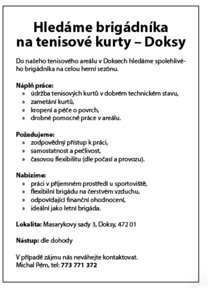 Hledáme brigádníka na tenisové kurty – Doksy
